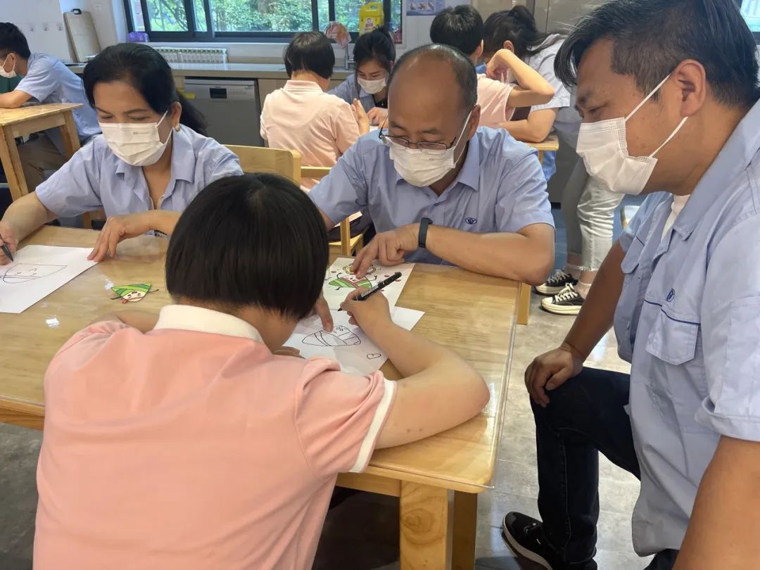 在本次捐赠活动中,常州儿童福利院老师给孩子们安排了一节互动绘画课程,端午到了,老师指导小朋友和叔叔、阿姨们手绘爱心粽子。